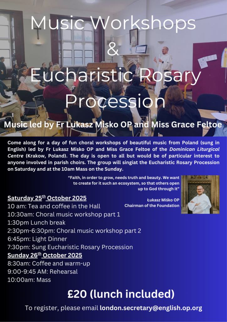 Join us for a day of great fun and great music! The event culminates in singing at the Eucharistic Rosary Procession on the Saturday and Mass on the Sunday. The cost is £20 and can be paid on the day. All are welcome. To register, please email london.secretary@english.op.org