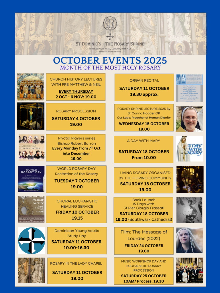 We have a packed schedule for the month of October which is the month of the Most Holy Rosary. We hope you can join us for all or some of the many events on offer. Please do share with others. For more information, please contact the parish secretary at london.secretary@english.op.org